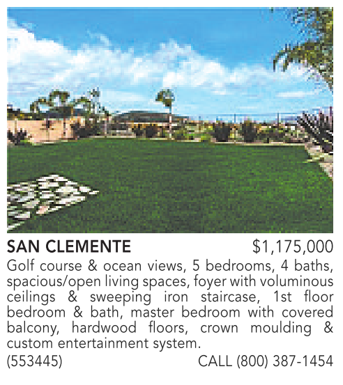 SAN CLEMENTE $1,175,000 Golf course & ocean views, 5 bedrooms, 4 baths, spacious/open living spaces, foyer with voluminous ceilings & sweeping iron staircase, 1st floor bedroom & bath, master bedroom with covered balcony, hardwood floors, crown moulding & custom entertainment system. (553445) CALL (800) 387-1454