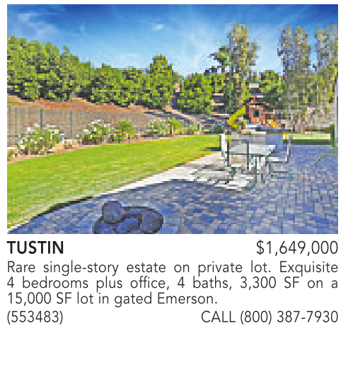 TUSTIN $1,649,000 Rare single-story estate on private lot. Exquisite 4 bedrooms plus office, 4 baths, 3,300 SF on a 15,000 SF lot in gated Emerson. (553483) CALL (800) 387-7930