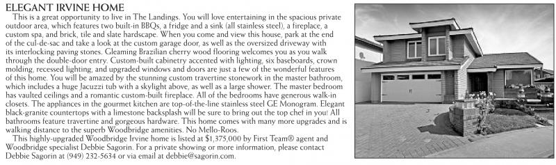 ELEGANT IRVINE HOME This is a great opportunity to live in The Landings. You will love entertaining in the spacious private outdoor area, which features two built-in BBQs, a fridge and a sink (all stainless steel), a fireplace, a custom spa, and brick, tile and slate hardscape. When you come and view this house, park at the end of the cul-de-sac and take a look at the custom garage door, as well as the oversized driveway with its interlocking paving stones. Gleaming Brazilian cherry wood flooring welcomes you as you walk through the double-door entry. Custom-built cabinetry accented with lighting, six baseboards, crown molding, recessed lighting, and upgraded windows and doors are just a few of the wonderful features of this home. You will be amazed by the stunning custom travertine stonework in the master bathroom, which includes a huge Jacuzzi tub with a skylight above, as well as a large shower. The master bedroom has vaulted ceilings and a romantic custom-built fireplace. All of the bedrooms have generous walk-in closets. The appliances in the gourmet kitchen are top-of-the-line stainless steel GE Monogram. Elegant black-granite countertops with a limestone backsplash will be sure to bring out the top chef in you! All bathrooms feature travertine and gorgeous hardware. This home comes with many more upgrades and is walking distance to the superb Woodbridge amenities. No Mello-Roos. This highly-upgraded Woodbridge Irvine home is listed at $1,375,000 by First Team® agent and Woodbridge specialist Debbie Sagorin. For a private showing or more information, please contact Debbie Sagorin at (949) 232-5634 or via email at debbie@sagorin.com.