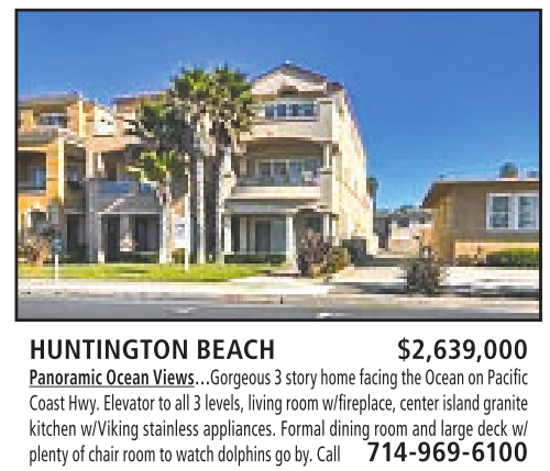 HUNTINGTON BEACH $2,639,000 Panoramic Ocean Views…Gorgeous 3story home facing theOcean on Pacific CoastHwy.Elevator to all3levels, living room w/fireplace,center island granite kitchen w/Viking stainless appliances. Formal dining room and large deck w/ plentyofchairroomtowatchdolphinsgoby. Call 714-969-6100