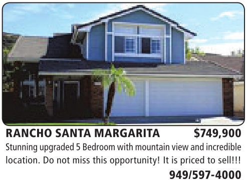 RANCHO SANTA MARGARITA $749,900 Stunningupgraded 5Bedroom with mountain view andincredible location. Do not miss this opportunity! It is priced tosell!!!