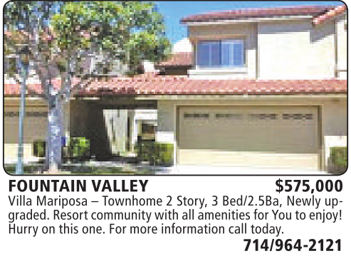 FOUNTAIN VALLEY $575,000 Villa Mariposa –Townhome 2Story, 3Bed/2.5Ba, Newly upgraded. Resortcommunity with allamenitiesfor Youtoenjoy!