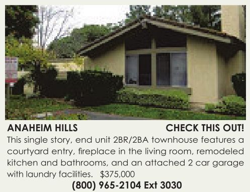 ANAHEIM HILLS CHECK THIS OUT! This single story, end unit 2BR/2BA townhouse features acourtyard entry, fireplace in the living room, remodeled kitchen and bathrooms, and an attached 2car garage with laundry facilities. $375,000 (800) 965-2104 Ext 3030
