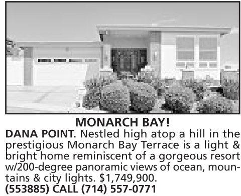 MONARCH BAY! DANA POINT. Nestled high atop a hill in the prestigious Monarch Bay Terrace is a light &bright home reminiscent of a gorgeous resort w/200-degree panoramic views of ocean, mountains & city lights. $1,749,900. (553885) CALL (714) 557-0771