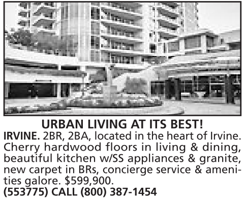 URBAN LIVING AT ITS BEST! IRVINE. 2BR, 2BA, located in the heart of Irvine. Cherry hardwood floors in living & dining, beautiful kitchen w/SS appliances & granite, new carpet in BRs, concierge service & amenities galore. $599,900. (553775) CALL (800) 387-1454