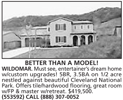 BETTER THAN A MODEL! WILDOMAR. Must see, entertainer’sdream home w/custom upgrades! 5BR, 3.5BA on 1/2 acre nestled against beautiful Cleveland National Park. Offers tile/hardwood flooring, great room w/FP & master w/retreat. $419,500. (553592) CALL (888) 307-0052