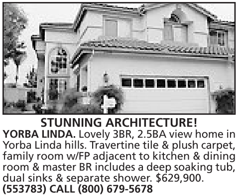 STUNNING ARCHITECTURE! YORBA LINDA. Lovely 3BR, 2.5BA view home in Yorba Lindahills. Travertine tile &plush carpet, family room w/FP adjacent to kitchen &dining room &master BR includes adeep soaking tub, dual sinks & separate shower. $629,900. (553783) CALL (800) 679-5678