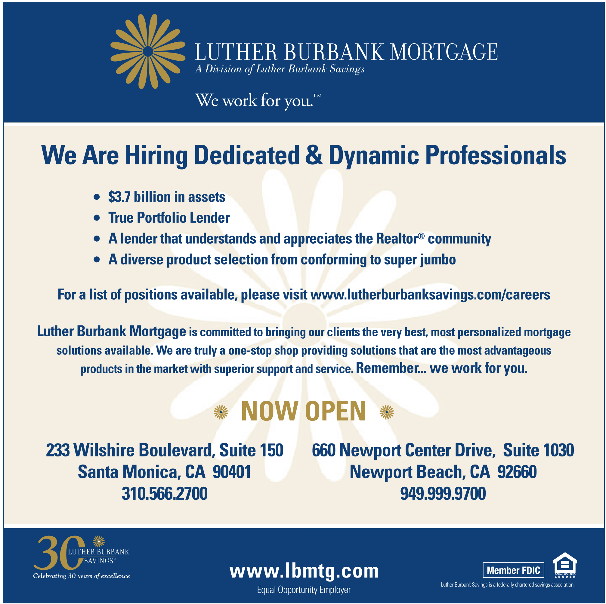 We Are Hiring Dedicated & Dynamic Professionals $3.7 billion in assets True Portfolio Lender A lender that understands and appreciates the Realtor® community A diverse product selection from conforming to super jumbo For a list of positions available, please visit www.lutherburbanksavings.com/careers Luther Burbank Mortgage is committed to bringing our clients the very best, most personalized mortgage solutions available. We are truly a one-stop shop providing solutions that are the most advantageous products in the market with superior support and service. Remember... we work for you. NOW OPEN 233 Wilshire Boulevard, Suite 150 Santa Monica, CA 90401 310.566.2700 660 Newport Center Drive, Suite 1030 Newport Beach, CA 92660 949.999.9700 Celebrating 30 years of excellence Equal Opportunity Employer Member FDIC Luther Burbank Savings is afederally chartered savings association.