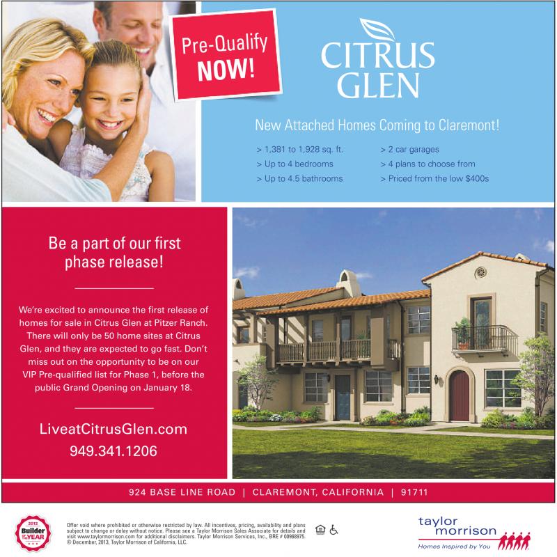 Offer void where prohibited or otherwise restricted by law. All incentives, pricing, availability and plans subject to change or delay without notice. Please see aTaylor Morrison Sales Associate for details and visit www.taylormorrison.com for additional disclaimers. Taylor Morrison Services, Inc., BRE #00968975. ©December,2013, Taylor Morrison of California, LLC.