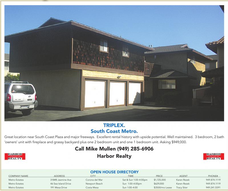 COMPANY NAME ADDRESS CITY TIME PRICE AGENT PHONE# Metro Estates 318#B Jasmine Ave Corona del Mar Sat &Sun 1:00-4:00pm $1,725,000 Karen Rezek 949.874.1119 Metro Estates 46Sea Island Drive Newport Beach Sun 1:00-4:00pm $629,000 Karen Rezek 949.874.1119 Metro Estates 191 Mesa Drive Costa Mesa Sun 1:00-4:00 $3500/mo Lease Tracy Stier 949.241.5591