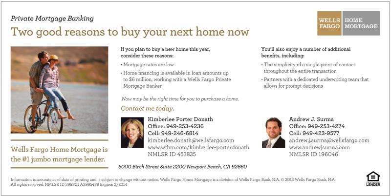 Private Mortgage Banking Two good reasons to buy your next home now If you plan to buy a new home this year, consider these reasons: • Mortgage rates are low • Home financing is available in loan amounts up to $6 million, working with a Wells Fargo Private Mortgage Banker Wells Fargo Home Mortgage is the #1 jumbo mortgage lender. Now may be the right time for you to purchase ahome. Contact me today. Kimberlee Porter Donath Office: 949-253-4236 Cell: 949-246-6814 kimberlee.donath@wellsfargo.com www.wfhm.com/kimberlee-porterdonath NMLSR ID 453835 5000 Birch Street Suite 2200 Newport Beach, CA 92660 You’ll also enjoy a number of additional benefits, including: • The simplicity of a single point of contact throughout the entire transaction • Partners with adedicated underwriting team that allows for prompt decisions Andrew J. Surma Office: 949-253-4274 Cell: 949-423-9577 andrew.j.surma@wellsfargo.com www.andrewjsurma.com NMLSR ID 196046 Information is accurate as of date of printing and is subject to change without notice. Wells Fargo Home Mortgage is adivision of Wells Fargo Bank, N.A. ©2013 Wells Fargo Bank, N.A. All rights reserved. NMLSR ID 399801 AS995488 Expires 2/2014