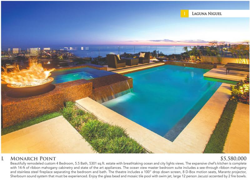 I Laguna Niguel I. Monarch Point $5,580,000 Beautifully remodeled custom 4 Bedroom, 5.5 Bath, 5301 sq.ft. estate with breathtaking ocean and city lights views. The expansive chef’s kitchen is complete with 14-ft of ribbon mahogany cabinetry and state of the art appliances. The ocean view master bedroom suite includes a see-through ribbon mahogany and stainless steel fireplace separating the bedroom and bath. The theatre includes a 100” drop down screen, 8 D-Box motion seats, Marantz projector, Sherbourn sound system that must be experienced. Enjoy the glass bead and mosaic tile pool with swim jet, large 12 person Jacuzzi accented by 2 fire bowls. See also