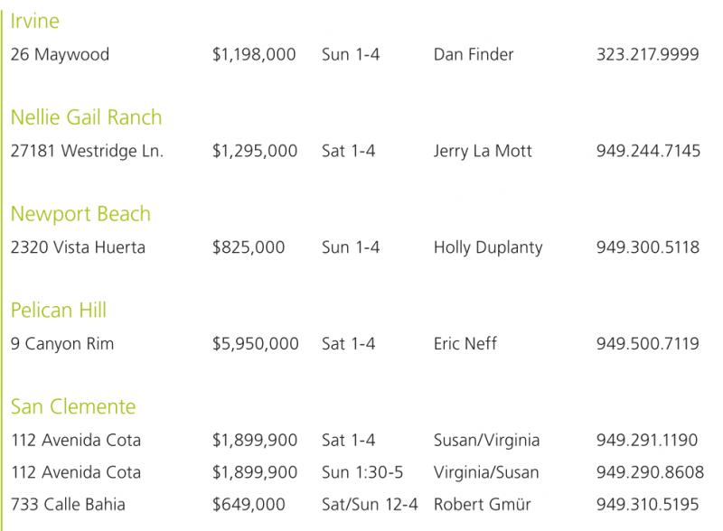 Irvine 26 Maywood $1,198,000 Sun 1-4 Dan Finder 323.217.9999 Nellie Gail Ranch 27181 Westridge Ln. $1,295,000 Sat 1-4 Jerry La Mott 949.244.7145