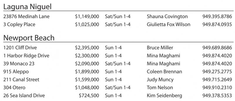 Laguna Niguel 23876 Medinah Lane $1,149,000 Sat/Sun 1-4 Shauna Covington 949.395.8786 3Copley Place $1,025,000 Sat/Sun 1-4 Giulietta FoxWilson 949.874.0935 Newport Beach 1201 CliffDrive $2,395,000 Sun 1-4 BruceMiller 949.689.8686 1Harbor Ridge Drive $2,300,000 Sun 1-4 Mina Maghami 949.874.4020 39 Monaco23 $2,090,000 Sat/Sun 1-4 Mina Maghami 949.874.4020 915 Aleppo $1,899,000 Sun 1-4 Coleen Brennan 949.275.2775 211 Canal Street $1,599,000 Sun 1-4 Judy Muncy 949.715.2649 304 Otero $1,048,000 Sat/Sun 1-4 TomNelson 949.910.2310 26 SeaIsland Drive $724,500 Sun 1-4 KimSeidenberg 949.378.5353 See also