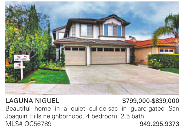 LAGUNA NIGUEL $799,000-$839,000 Beautiful home in a quiet cul-de-sac in guard-gated San Joaquin Hills neighborhood. 4 bedroom, 2.5 bath. MLS# OC56789 949.295.9373