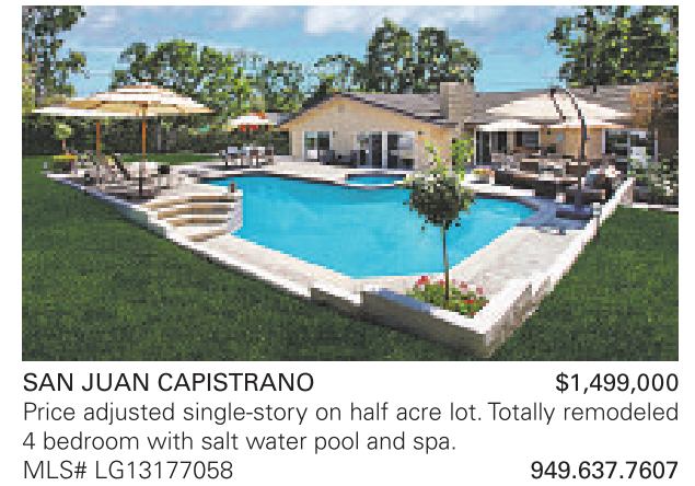 SAN JUAN CAPISTRANO $1,499,000 Price adjusted single-story on half acre lot. Totally remodeled 4 bedroom with salt water pool and spa. MLS# LG13177058 949.637.7607