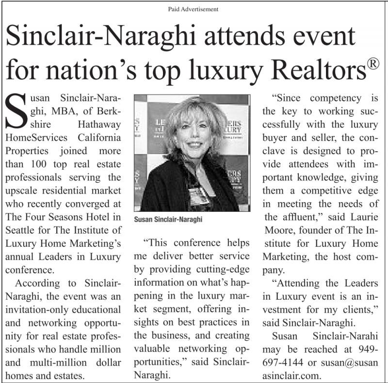 Sinclair-Naraghi, MBA, of Berkshire Hathaway HomeServices California Properties joined more than 100 top real estate professionals serving the upscale residential market who recently converged at The Four Seasons Hotel in Seattle for The Institute of Luxury Home Marketing’s annual Leaders in Luxury conference.