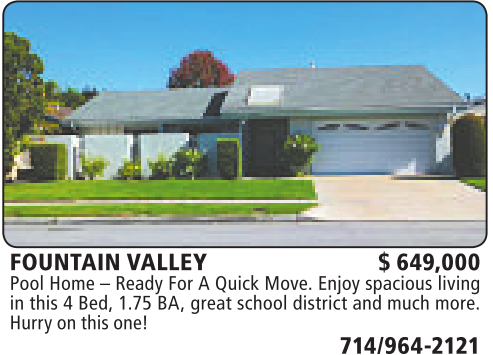 FOUNTAIN VALLEY $ 649,000 Pool Home –Ready For AQuick Move. Enjoy spacious living