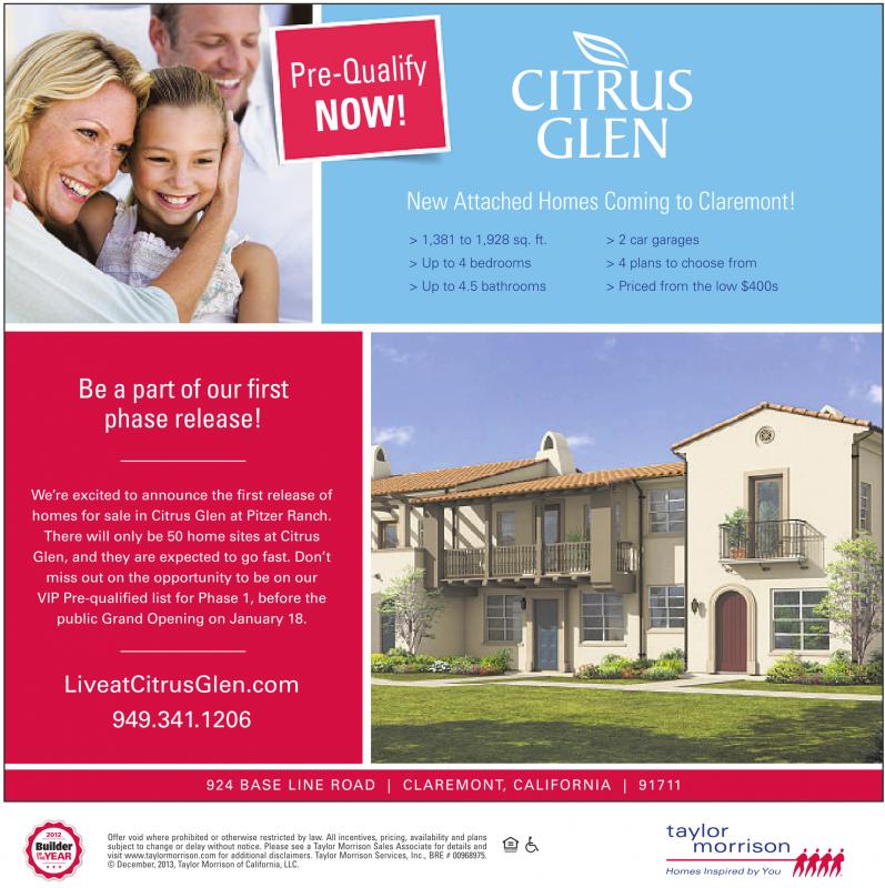 New Attached Homes Coming to Claremont! > 1,381 to 1,928 sq. ft. > Up to 4 bedrooms > Up to 4.5 bathrooms > 2 car garages > 4 plans to choose from > Priced from the low $400s Be a part of our first phase release! We’re excited to announce the first release of homes for sale in Citrus Glen at Pitzer Ranch. There will only be 50 home sites at Citrus Glen, and they are expected to go fast. Don’t miss out on the opportunity to be on our VIP Pre-qualified list for Phase 1, before the public Grand Opening on January 18. LiveatCitrusGlen.com 949.341.1206 924 BASE LINE ROAD | CLAREMONT, CALIFORNIA | 91711 2012 Offer void where prohibited or otherwise restricted by law. All incentives, pricing, availability and plans subject to change or delay without notice. Please see aTaylor Morrison Sales Associate for details and visit www.taylormorrison.com for additional disclaimers. Taylor Morrison Services, Inc., BRE #00968975. ©December,2013, Taylor Morrison of California, LLC.
