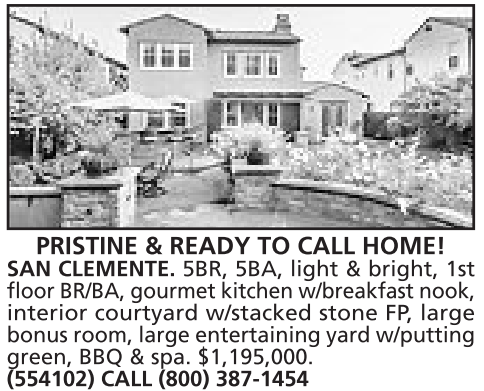PRISTINE & READY TO CALL HOME! SAN CLEMENTE. 5BR, 5BA, light & bright, 1st floor BR/BA, gourmet kitchen w/breakfast nook, interior courtyard w/stacked stone FP, large bonus room, large entertaining yard w/putting green, BBQ & spa. $1,195,000. (554102) CALL (800) 387-1454