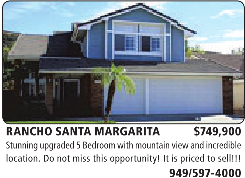 RANCHO SANTA MARGARITA $749,900 Stunningupgraded 5Bedroom with mountain view andincredible location. Do not miss this opportunity! It is priced tosell!!!