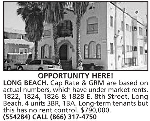 Beach. 4units 3BR, 1BA. Long-term tenants but this has no rent control. $790,000. (554284) CALL (866) 317-4750