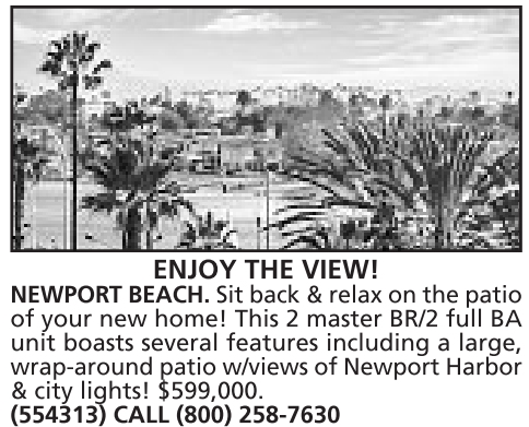NEWPORTBEACH. Sit back &relax on the patio of your new home! This 2 master BR/2 full BA unit boasts several features including a large, wrap-around patio w/views of Newport Harbor & city lights! $599,000. (554313) CALL (800) 258-7630