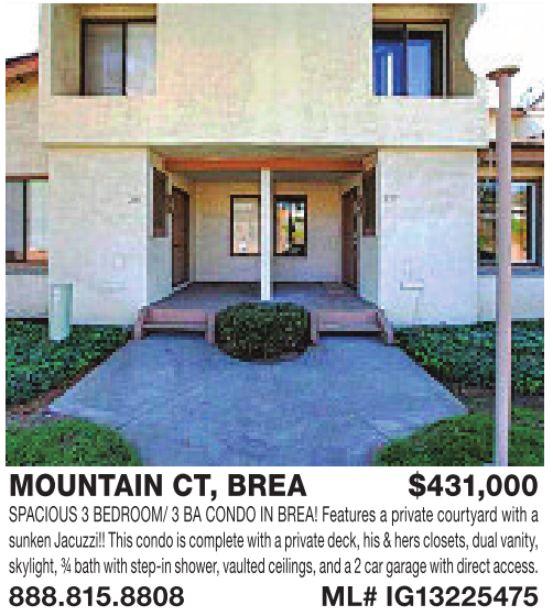 MOUNTAIN CT, BREA $431,000 SPACIOUS 3BEDROOM/ 3BACONDO IN BREA! Features aprivate courtyard with asunkenJacuzzi!! This condo is complete with aprivate deck,his &hersclosets, dualvanity, skylight, ¾bathwithstep-in shower, vaultedceilings, anda2car garage with direct access. 888.815.8808 ML# IG13225475