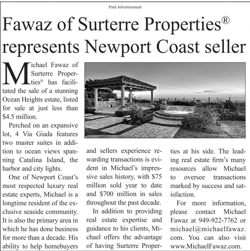 Fawaz of Surterre Properties ® represents Newport Coast seller Michael Fawaz of Surterre Properties ® has facilitated the sale of a stunning Ocean Heights estate, listed for sale at just less than $4.5 million. Perched on an expansive lot, 4 Via Giada features two master suites in addition to ocean views spanning Catalina Island, the harbor and city lights. One of Newport Coast’s most respected luxury real estate experts, Michael is a longtime resident of the exclusive seaside community. It is also the primary area in which he has done business for more than a decade. His ability to help homebuyers PaidAdvertisement and sellers experience rewarding transactions is evident in Michael’s impressive sales history, with $75 million sold year to date and $700 million in sales throughout the past decade. In addition to providing real estate expertise and guidance to his clients, Michael offers the advantage of having Surterre Proper ties at his side. The leading real estate firm’s many resources allow Michael to oversee transactions marked by success and satisfaction. For more information, please contact Michael Fawaz at 949-922-7762 or michael@michaelfawaz. com. You can also visit www.MichaelFawaz.com.