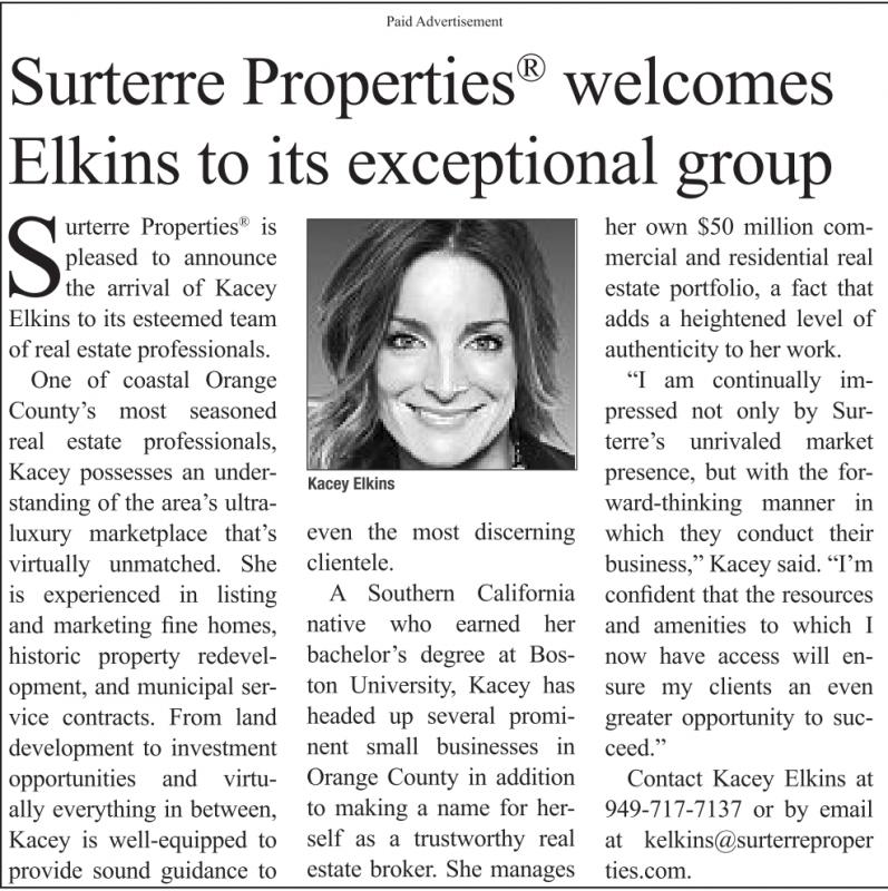 Paid Advertisement Surterre Properties ® welcomes Elkins to its exceptional group Surterre Properties ® is pleased to announce the arrival of Kacey Elkins to its esteemed team of real estate professionals. One of coastal Orange County’s most seasoned real estate professionals, Kacey possesses an understanding of the area’s ultraluxury marketplace that’s virtually unmatched. She is experienced in listing and marketing fine homes, historic property redevelopment, and municipal service contracts. From land development to investment opportunities and virtually everything in between, Kacey is well-equipped to provide sound guidance to Kacey Elkins even the most discerning clientele. A Southern California native who earned her bachelor’s degree at Boston University, Kacey has headed up several prominent small businesses in Orange County in addition to making a name for herself as a trustworthy real estate broker. She manages her own $50 million commercial and residential real estate portfolio, a fact that adds a heightened level of authenticity to her work. “I am continually impressed not only by Surterre’s unrivaled market presence, but with the forward-thinking manner in which they conduct their business,” Kacey said. “I’m confident that the resources and amenities to which I now have access will ensure my clients an even greater opportunity to succeed.” Contact Kacey Elkins at 949-717-7137 or by email at kelkins@surterreproper ties.com. See also