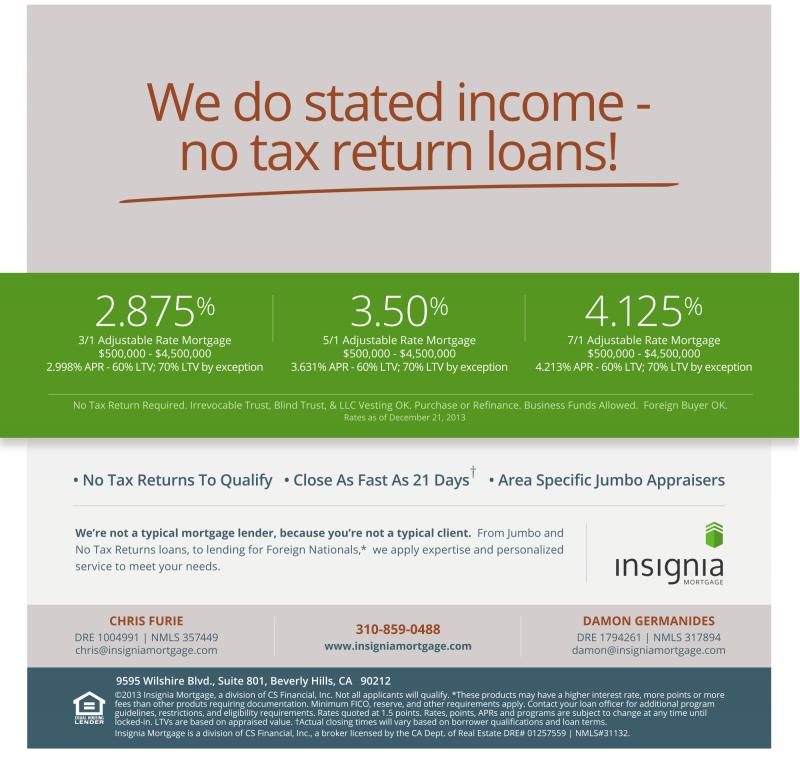 • No Tax Returns To Qualify • Close As Fast As 21 Days • Area Specific Jumbo Appraisers