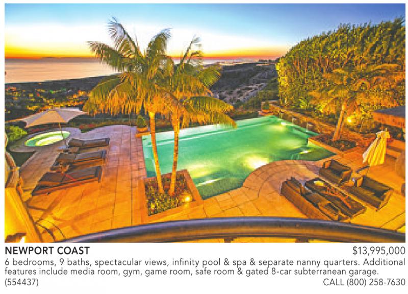 NEWPORT COAST $13,995,000 6 bedrooms, 9 baths, spectacular views, infinity pool & spa & separate nanny quarters. Additional features include media room, gym, game room, safe room & gated 8-car subterranean garage. (554437) CALL (800) 258-7630