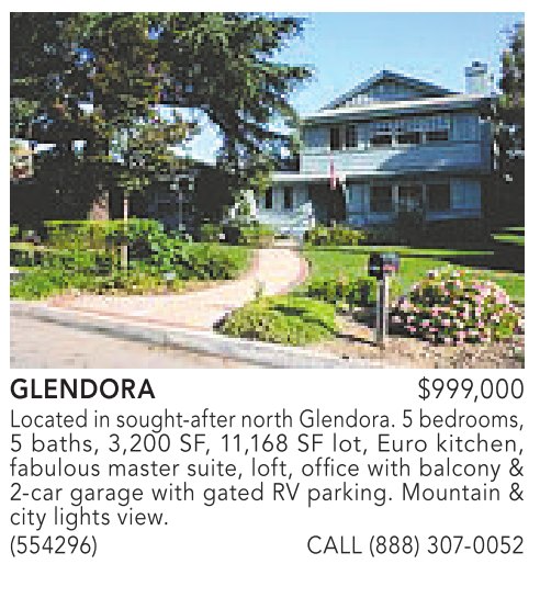GLENDORA $999,000 Located insought-after northGlendora. 5bedrooms, 5 baths, 3,200 SF, 11,168 SF lot, Euro kitchen, fabulous master suite, loft, office with balcony & 2-car garage with gated RV parking. Mountain & city lights view. (554296) CALL (888) 307-0052
