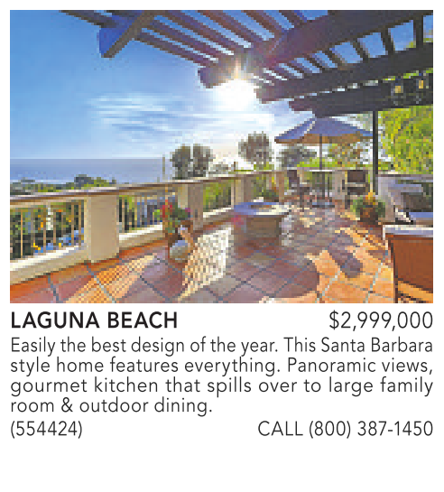 LAGUNA BEACH $2,999,000 Easily the best design of the year. This Santa Barbara style home features everything. Panoramic views, gourmet kitchen that spills over to large family room & outdoor dining. (554424) CALL (800) 387-1450