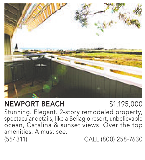 NEWPORT BEACH $1,195,000 Stunning. Elegant. 2-story remodeled property, spectacular details, like aBellagio resort,unbelievable ocean, Catalina & sunset views. Over the top amenities. A must see. (554311) CALL (800) 258-7630