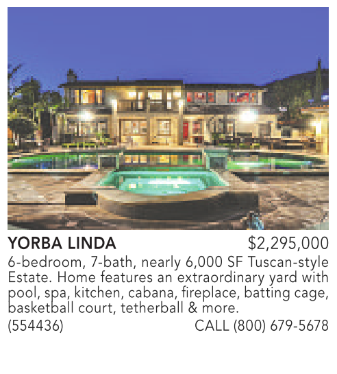 YORBA LINDA $2,295,000 6-bedroom, 7-bath, nearly 6,000 SF Tuscan-style Estate. Home features an extraordinary yard with pool, spa, kitchen, cabana, fireplace, batting cage, basketball court, tetherball & more. (554436) CALL (800) 679-5678