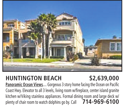 HUNTINGTON BEACH $2,639,000 Panoramic Ocean Views… Gorgeous 3story home facing theOcean on Pacific CoastHwy.Elevator to all3levels, living room w/fireplace,center island granite kitchen w/Viking stainless appliances. Formal dining room and large deck w/ plentyofchairroomtowatchdolphinsgoby. Call 714-969-6100