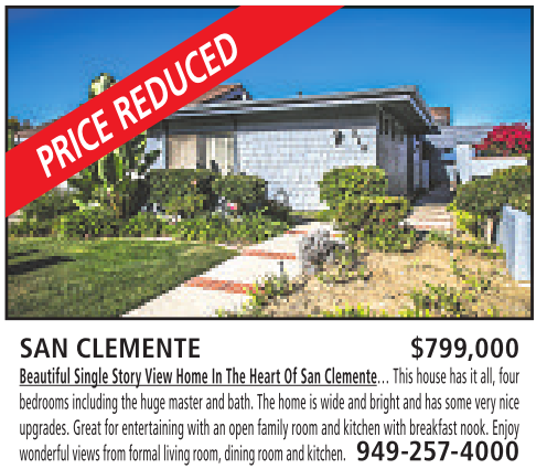SAN CLEMENTE $799,000 Beautiful Single Story View Home In The Heart OfSanClemente… This house has it all, four bedrooms including the huge master and bath. The home is wide and bright and has some very nice upgrades. Great for entertaining with anopen family room and kitchen with breakfast nook. Enjoy wonderfulviews from formal living room,diningroomand kitchen. 949-257-4000