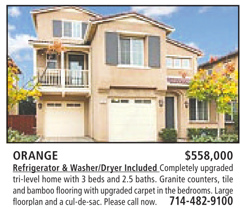 ORANGE $558,000 Refrigerator &Washer/Dryer Included Completely upgraded tri-level home with 3beds and 2.5 baths. Granite counters, tile andbamboo flooring with upgraded carpet in thebedrooms.Large floorplanand acul-de-sac. Pleasecallnow. 714-482-9100
