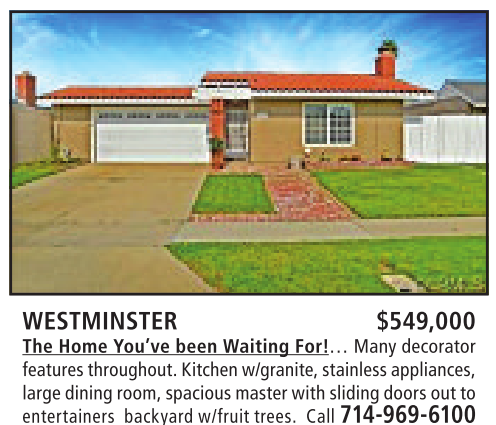 features throughout.Kitchen w/granite,stainlessappliances, largediningroom, spacious masterwithsliding doors outto entertainers backyard w/fruit trees. Call 714-969-6100