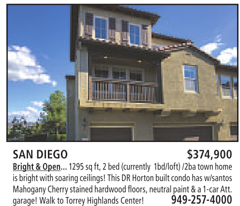 SAN DIEGO $374,900 Bright &Open... 1295 sq ft,2bed (currently 1bd/loft)/2batownhome is brightwithsoaring ceilings!This DR Horton builtcondohas w/santos MahoganyCherry stained hardwood floors,neutral paint &a1-car Att. garage! Walk to Torrey Highlands Center! 949-257-4000