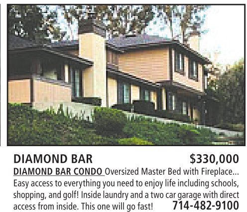 DIAMOND BAR $330,000 DIAMOND BAR CONDO Oversized Master Bed with Fireplace... Easy access to everythingyou need to enjoylifeincluding schools, shopping, andgolf!Insidelaundry andatwo cargaragewithdirect access from inside. This one will go fast! 714-482-9100