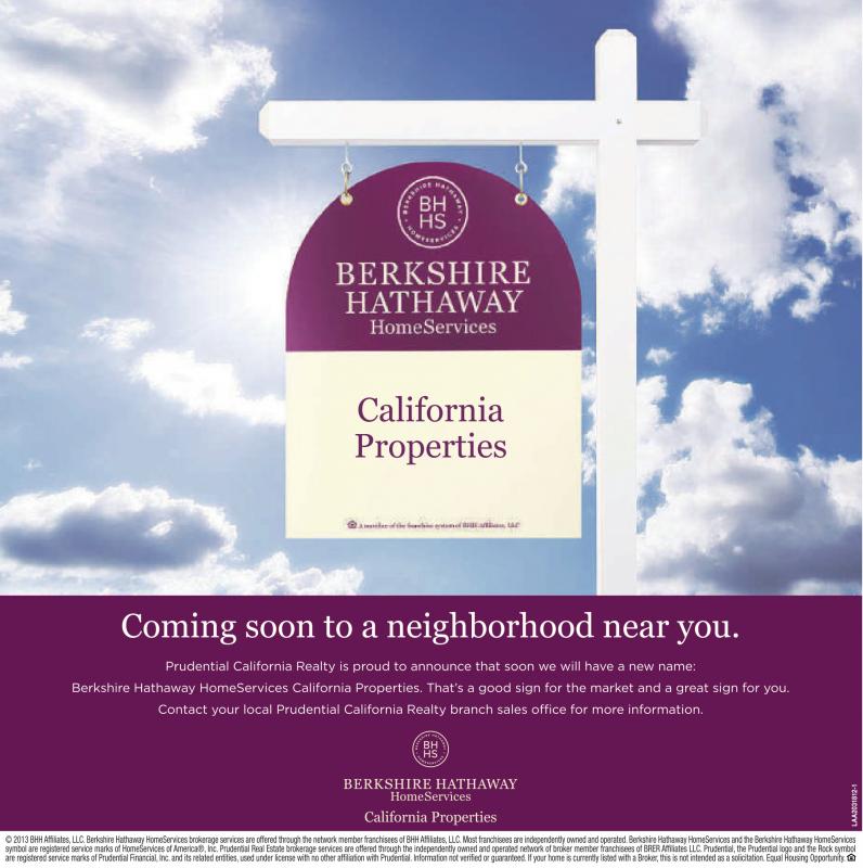 California Properties Coming soon to a neighborhood near you. Prudential California Realty is proud to announce that soon we will have a new name: Berkshire Hathaway HomeServices California Properties. That’s a good sign for the market and a great sign for you. Contact your local Prudential California Realty branch sales office for more information. California Properties ©2013 BHH Affiliates, LLC. Berkshire Hathaway HomeServices brokerage services are offered through the network member franchisees of BHH Affiliates, LLC. Most franchisees are independently owned and operated. Berkshire Hathaway HomeServices and the Berkshire Hathaway HomeServices symbol are registered service marks of HomeServices of America®, Inc. Prudential Real Estate brokerage services are offered through the independently owned and operated network of broker member franchisees of BRER Affiliates LLC. Prudential, the Prudential logo and the Rock symbol are registered service marks of Prudential Financial, Inc. and its related entities, used under license with no other affiliation with Prudential. Information not verified or guaranteed. If your home is currently listed with aBroker,this is not intended as asolicitation. Equal Housing Opportunity.