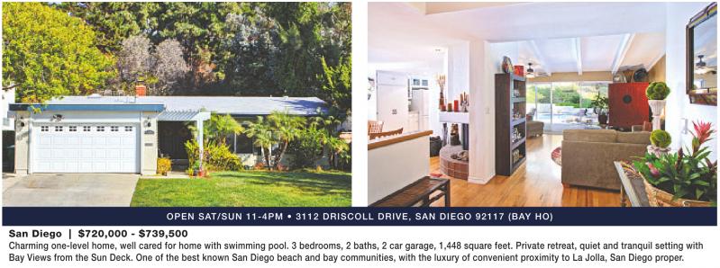 San Diego | $720,000 - $739,500 OPEN SAT/SUN 11-4PM • 3112 DRISCOLL DRIVE, SAN DIEGO 92117 (BAY HO) Charming one-level home, well cared for home with swimming pool. 3 bedrooms, 2 baths, 2 car garage, 1,448 square feet. Private retreat, quiet and tranquil setting with Bay Views from the Sun Deck. One of the best known San Diego beach and bay communities, with the luxury of convenient proximity to La Jolla, San Diego proper.