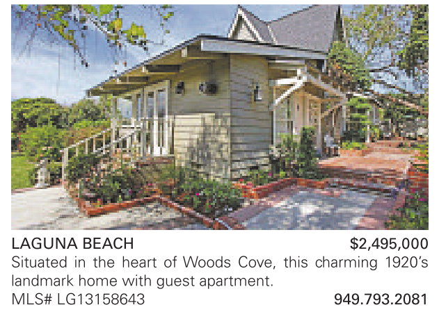 LAGUNA BEACH $2,495,000 Situated in the heart of Woods Cove, this charming 1920’s landmark home with guest apartment. MLS# LG13158643 949.793.2081