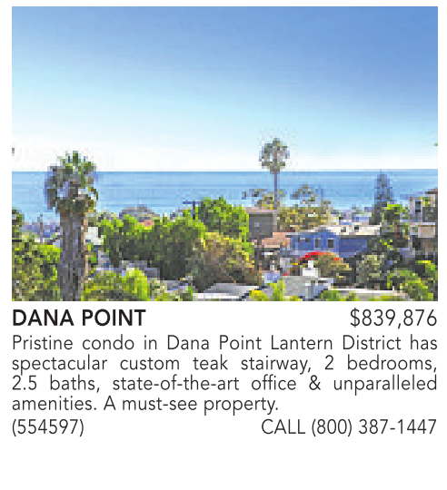 DANA POINT $839,876 Pristine condo in Dana Point Lantern District has spectacular custom teak stairway, 2 bedrooms, 2.5 baths, state-of-the-art office & unparalleled amenities. A must-see property. (554597) CALL (800) 387-1447