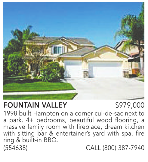 FOUNTAIN VALLEY $979,000 1998 built Hampton on a corner cul-de-sac next to a park. 4+ bedrooms, beautiful wood flooring, a massive family room with fireplace, dream kitchen with sitting bar & entertainer’s yard with spa, fire ring & built-in BBQ. (554638) CALL (800) 387-7940