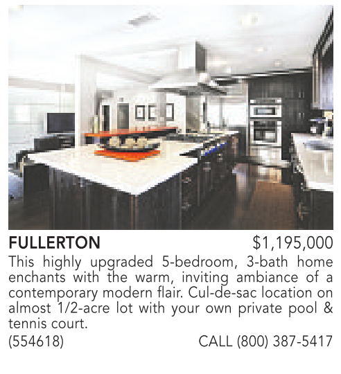 FULLERTON $1,195,000 This highly upgraded 5-bedroom, 3-bath home enchants with the warm, inviting ambiance of a contemporary modern flair. Cul-de-sac location on almost 1/2-acre lot with your own private pool & tennis court. (554618) CALL (800) 387-5417