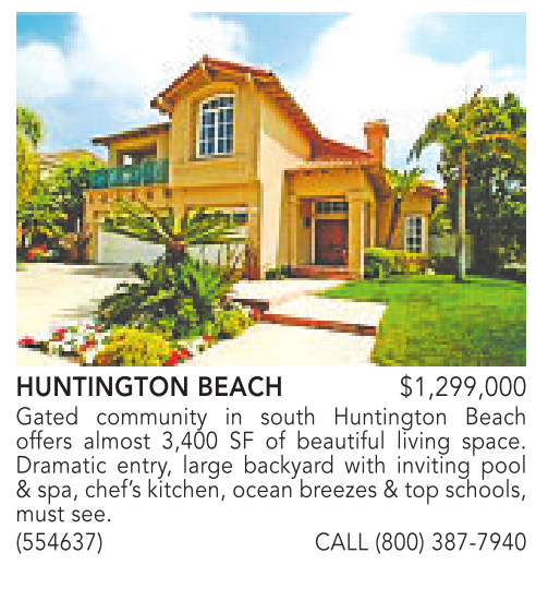 HUNTINGTON BEACH $1,299,000 Gated community in south Huntington Beach offers almost 3,400 SF of beautiful living space. Dramatic entry, large backyard with inviting pool & spa, chef’s kitchen, ocean breezes & top schools, must see. (554637) CALL (800) 387-7940