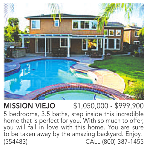 MISSION VIEJO $1,050,000 - $999,900 5 bedrooms, 3.5 baths, step inside this incredible home that is perfect for you. With so much to offer, you will fall in love with this home. You are sure to be taken away by the amazing backyard. Enjoy. (554483) CALL (800) 387-1455